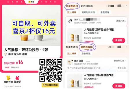 2、美团饮品补贴限时低价秒杀!直接买对应饮品兑换券抵扣使用