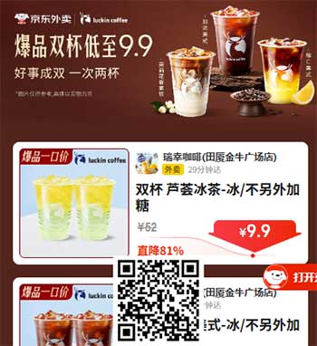 京东瑞幸9.9两杯/19.9五杯兔运费兔包装费