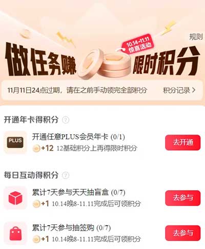 即日起-11月11日,京东Plus会员做简单任务送2积分