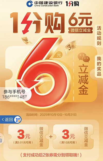 路径:建行生活App-首页,热门活动,一分购6元立减金