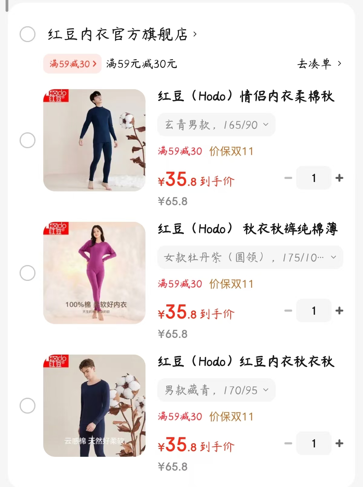 先领2张卷 ① ② 红豆服饰合集 ①内衣秋衣秋裤纯棉套装 低圆领 圆领 半高圆领