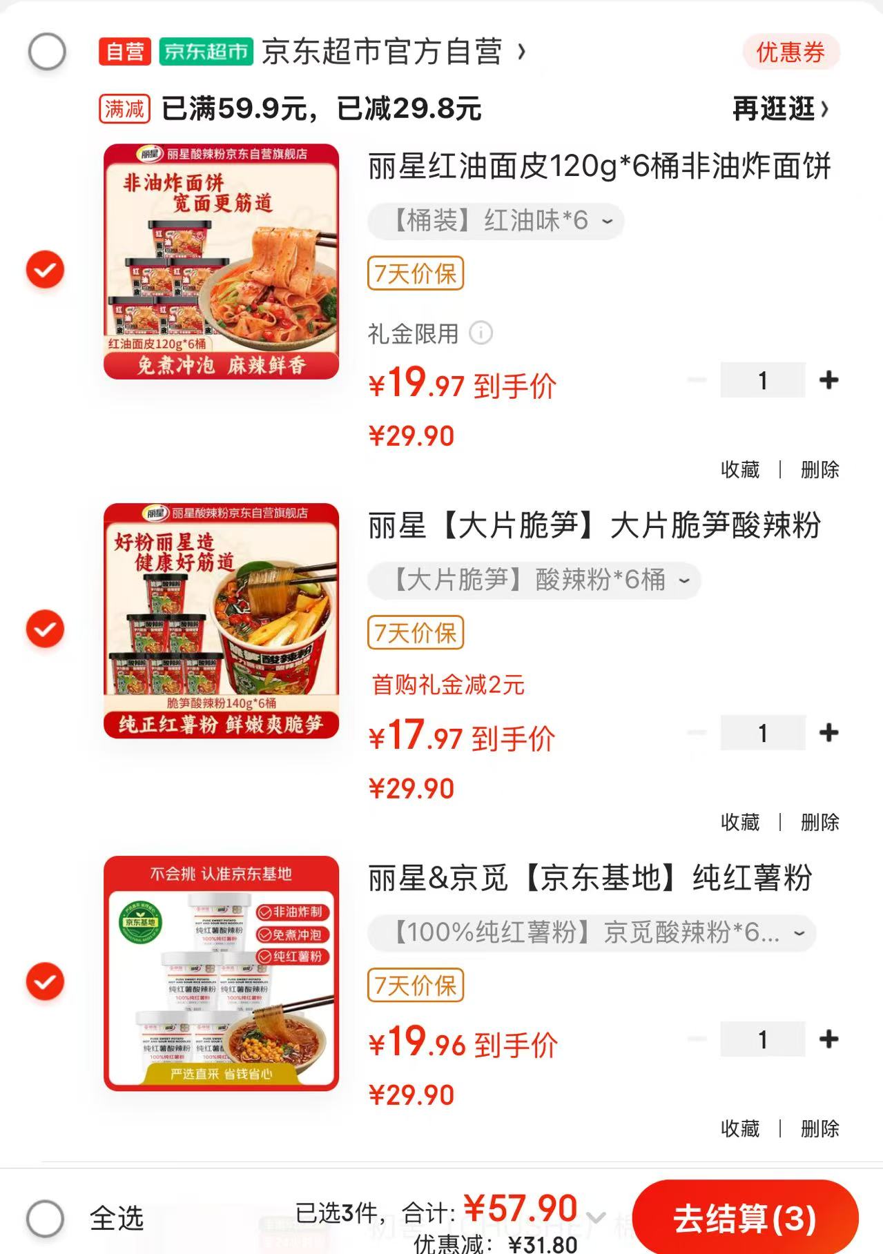 自营 丽星酸辣粉合集 6桶 纯红薯/辣片卷/脆笋/豆芽/荆芥/红油麻酱味 任选59.9元+u