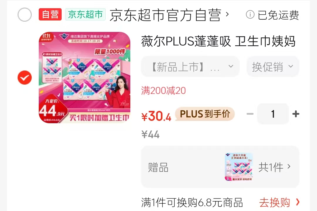 先入会 跳转APP领200-20卷 再领40-7券 自营薇尔PLUS蓬蓬吸加长日用8片*5包