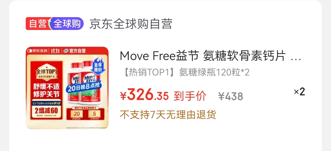 【自营】益节 氨糖素钙片 绿瓶120粒*2瓶