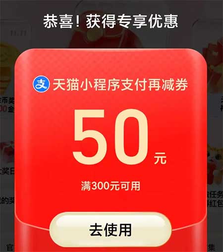 吱付宝搜,双十一抽9次,有的中300-50的小程序支付红包