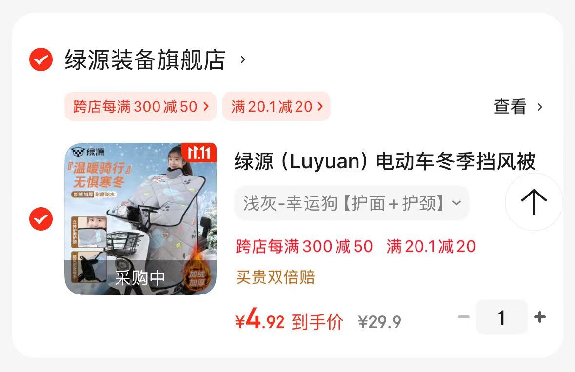 速撸!4.9元得电动车挡风被 跳APP特价领20.1-20卷 绿源 电动车冬季加厚挡风被